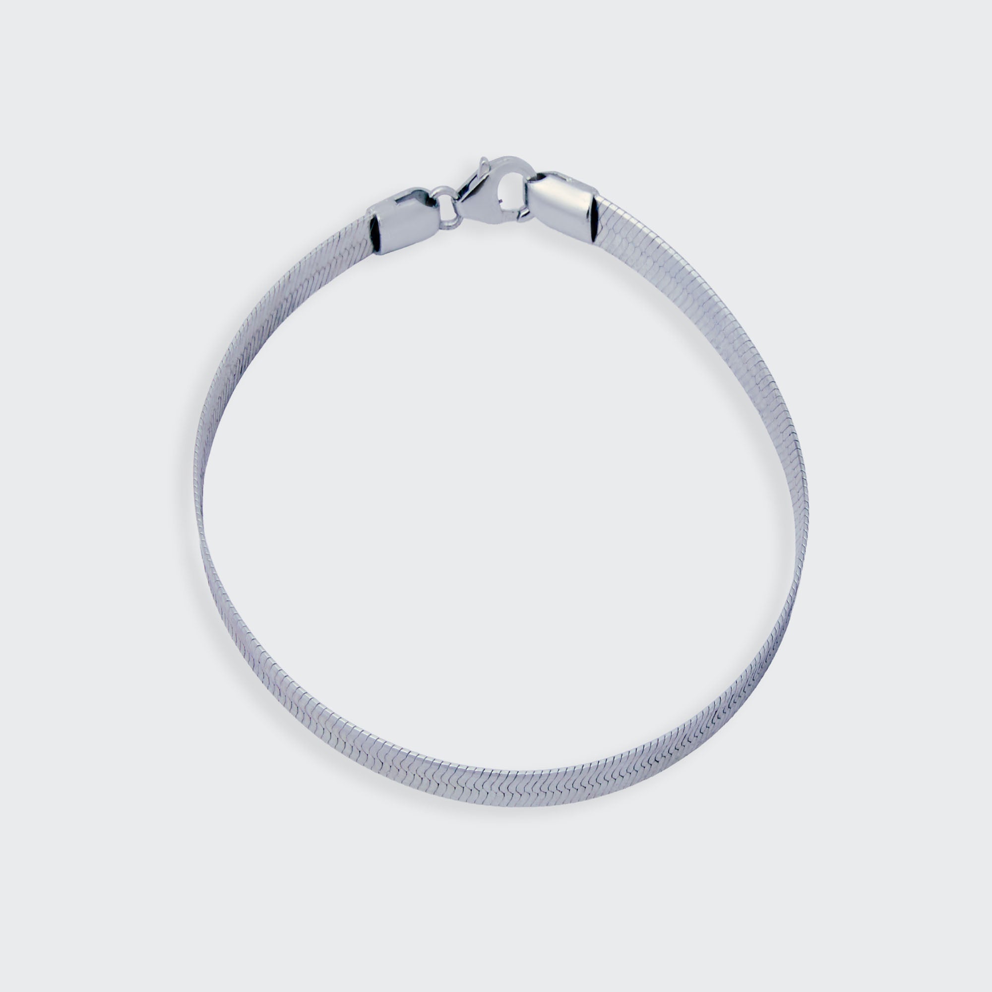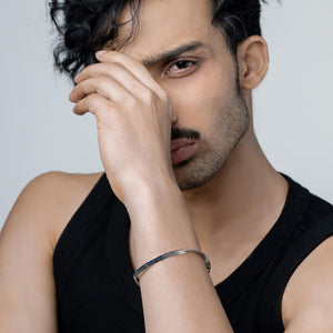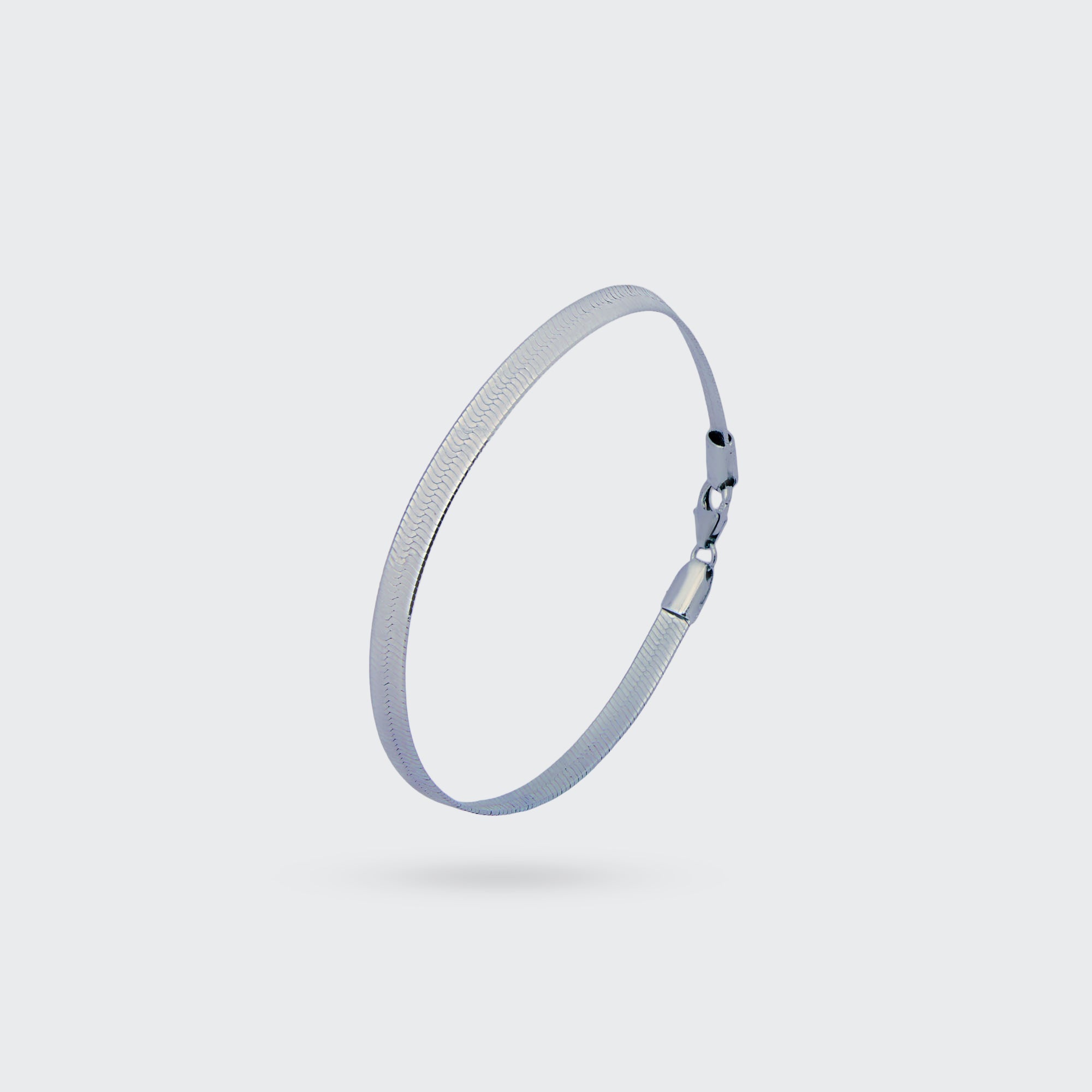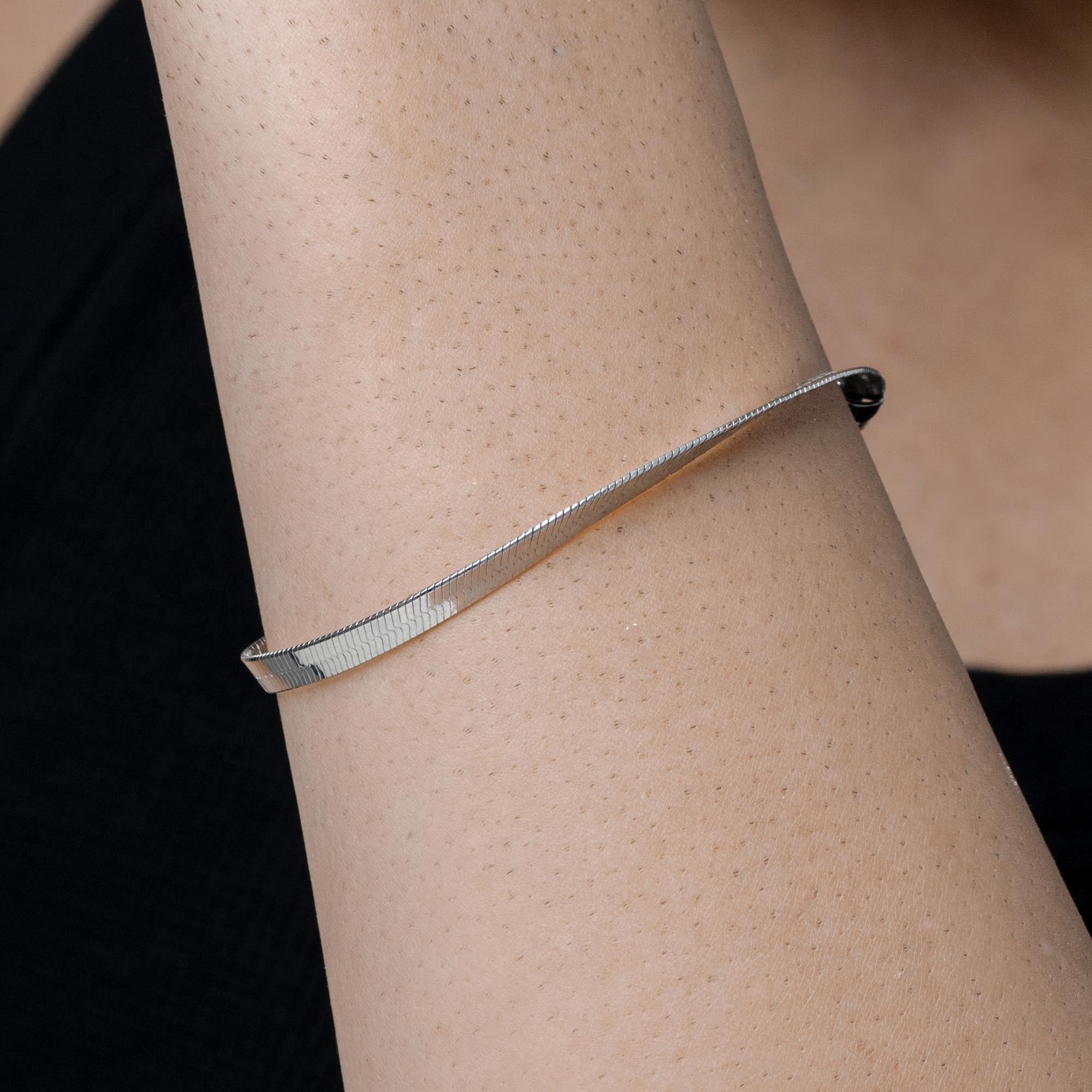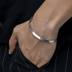 The Sleek Silver Bracelet features smooth, polished silver in a sleek, curve-hugging design. The minimalist aesthetic with fine texture reflects sophistication and modern elegance, perfect for adding a touch of luxury to any look
