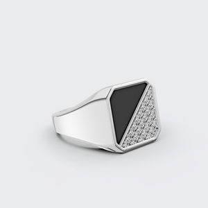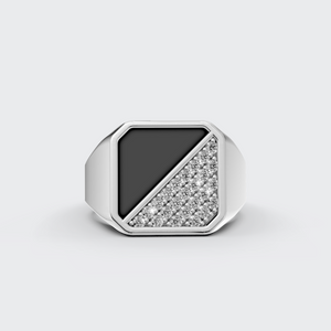 A sleek two-tone design with a striking contrast—jet-black enamel meets a pavé of shimmering stones, making this ring the definition of modern luxury.