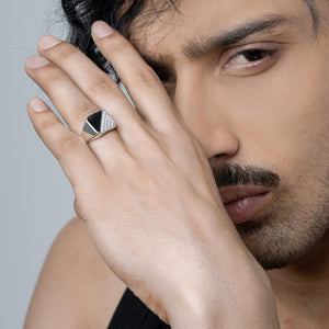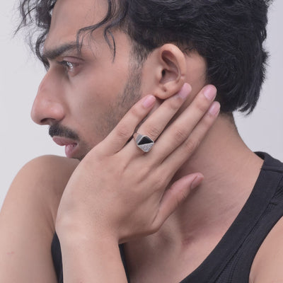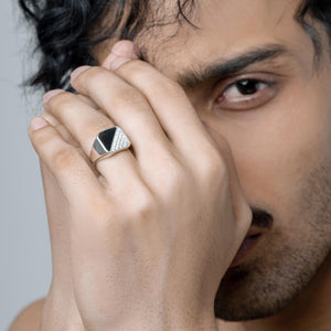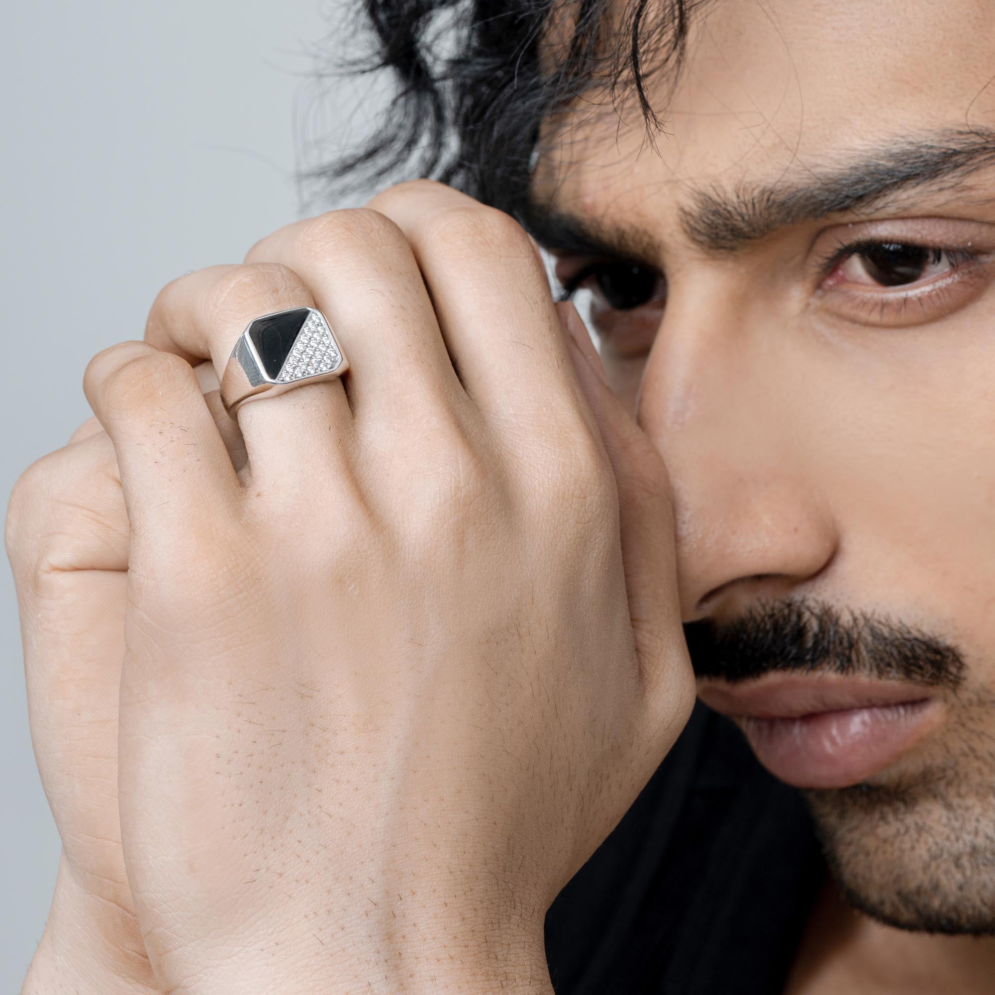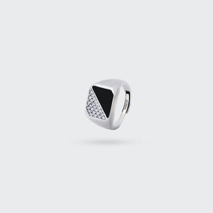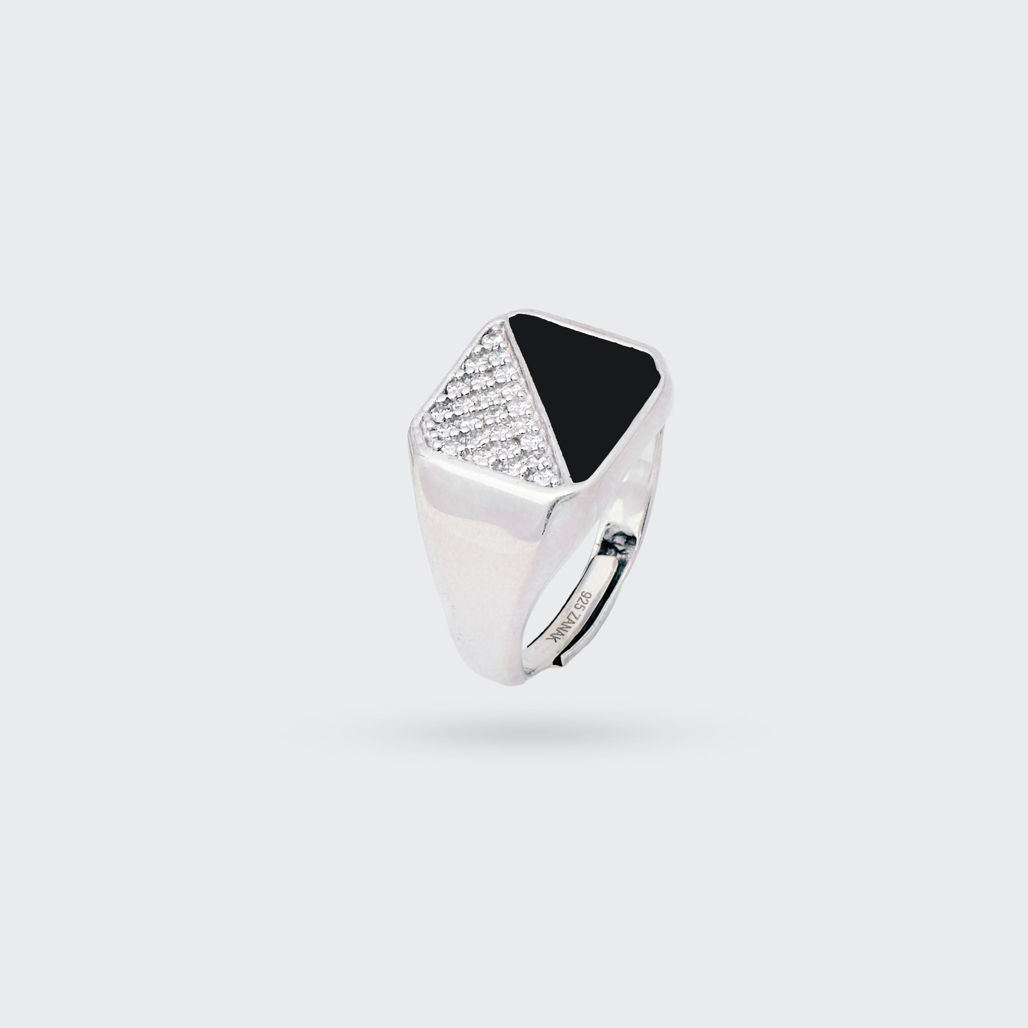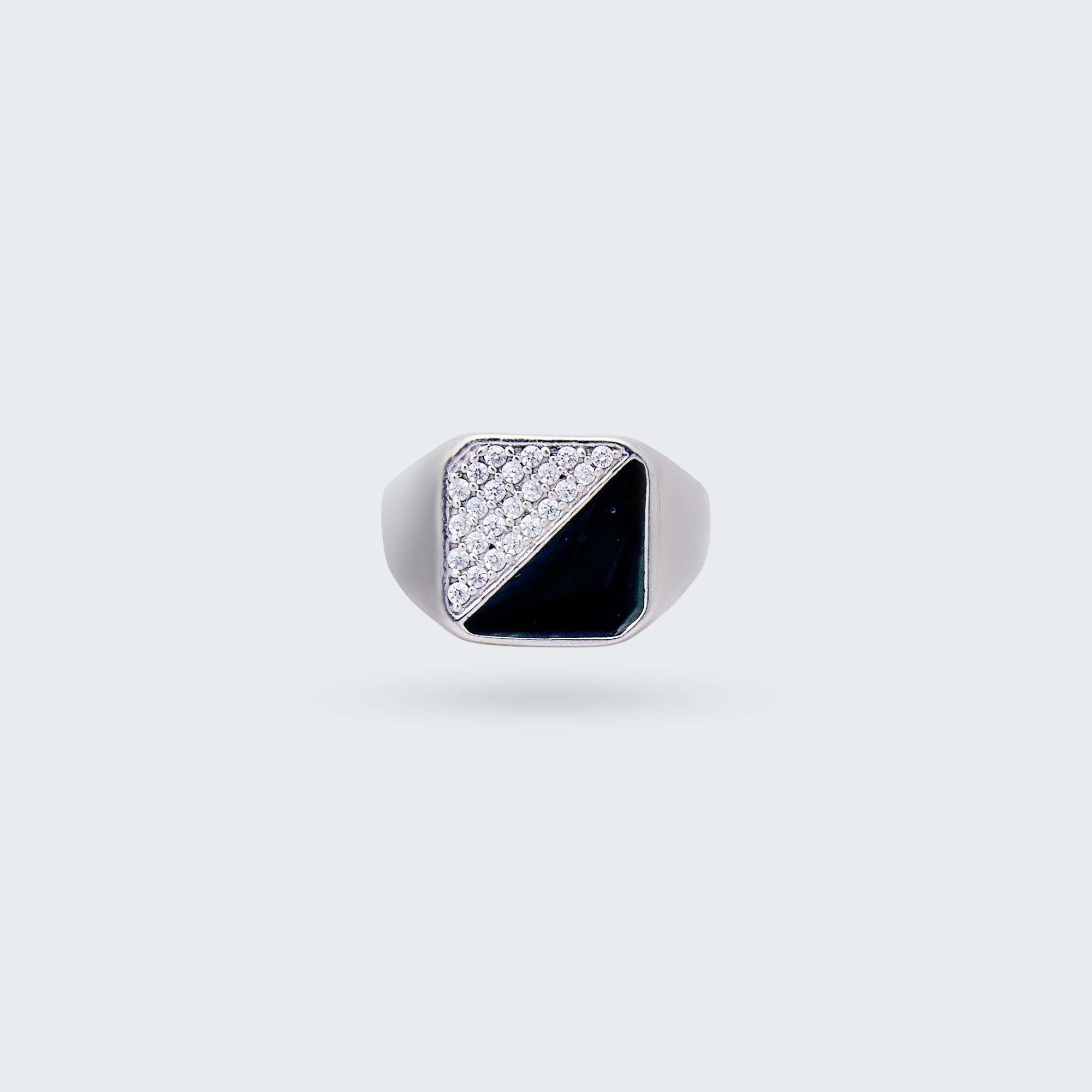 A sleek two-tone design with a striking contrast—jet-black enamel meets a pavé of shimmering stones, making this ring the definition of modern luxury.